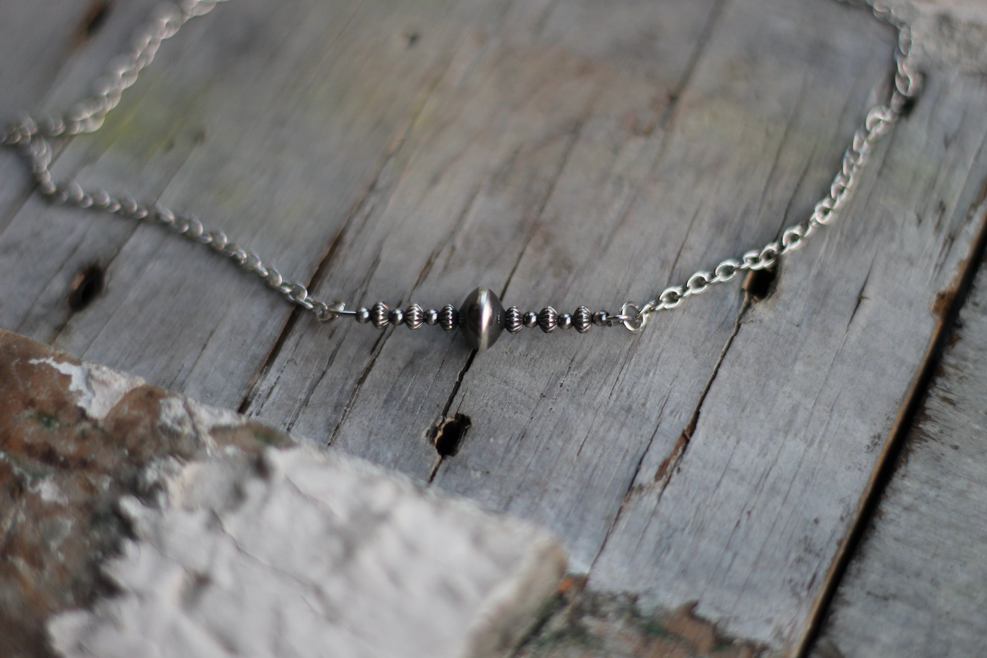 - 6 mm center genuine saucer Navajo pearl with sterling silver saucers and 2 mm Navajo Pearl accent beads